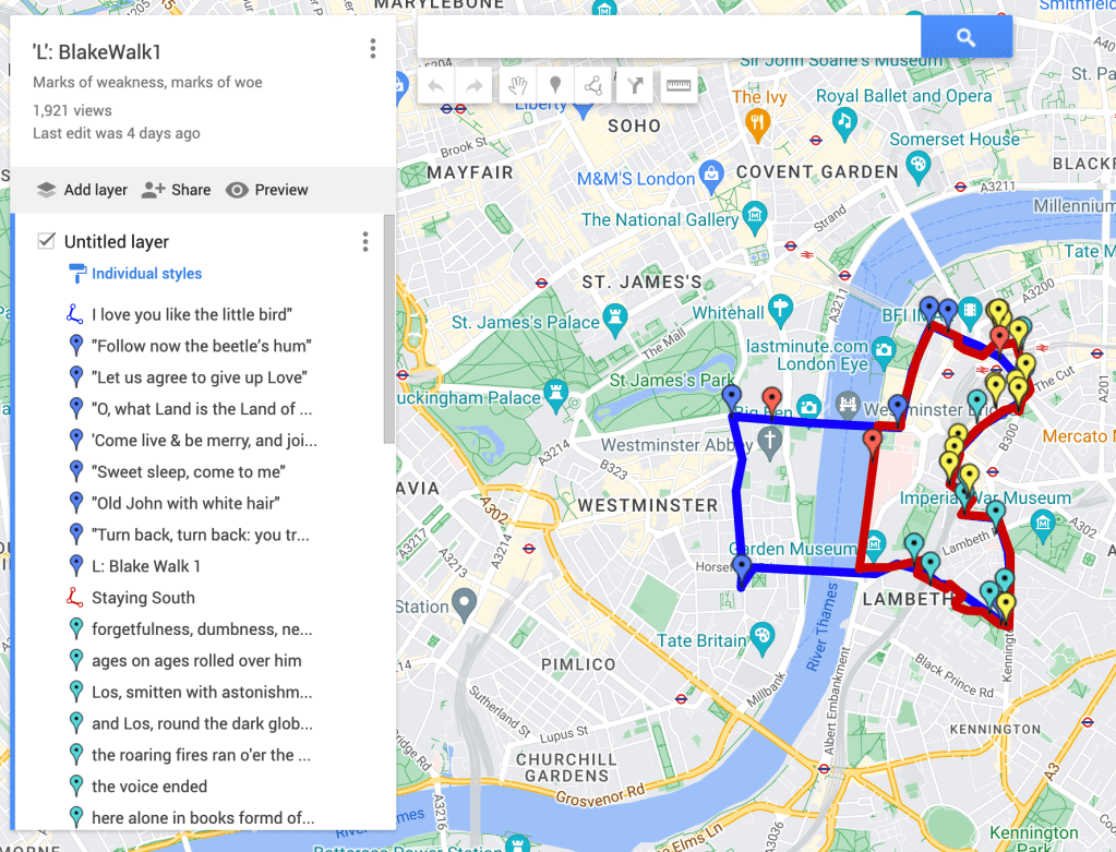 I liked very much the idea of helping Toby to recreate or replay this idea of walking around town and unlocking ‘visions’ as he walked along a particular path. So I’ve already mapped out 3 Blake Walks for him, and started generating rather abstract media to put in his way.