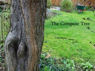 Think of the compote tree constantly being bombarded with rumbles and vibrations, tumults and quakes. Think of water trickling and gurgling underground. And the beetles and worms, the slugs and the nematodes and the ants all busy scratching and scraping, boring and writhing. And the creaks and the cracklings of other roots, other plants swelling and popping, quite literally ‘rooting’ around for moisture and nutrients.