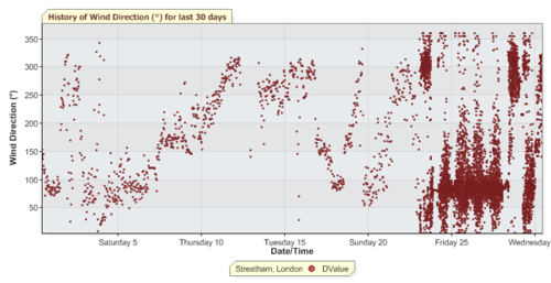 For example, I have been watching the weather. Thanks to the very marvellous London Grid For Learning Weather Monitoring System, I have been grabbing all the relevant data from the Streatham weather station. Here, for example, is a spreadsheet with all the weather data for my area for the last 30 days or so: Download Streathamweatheraprmay2012