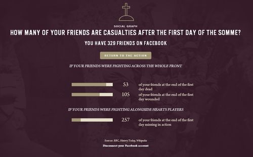 Importantly, we also wanted to create something personal, that packed the kind of emotional punch that younger people could empathise with. With that in mind, we added elements such as Facebook integration so we could bring the story closer to home, by displaying how *your* friends might have fared at various stages in the war: how many of your friends might have died at the Somme, for example; or what kind of work women friends would be doing in 1917.
